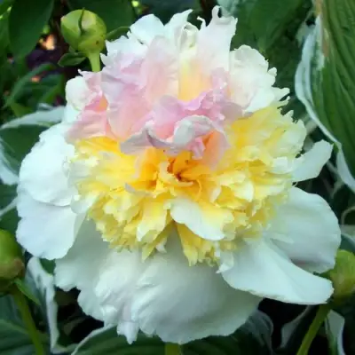 Цветки настоящий звездный аккорд его внешнего вида. Они крупные, диаметром от 16 до 18 см, со сложной махровой и корончатой структурой. Внешние светло-розовые лепестки окружают корону из ярко-желтых петалодиев, из центра которым выходит изящный розовый шар. Этот двухцветный и светлый по окраске цветок открывается как анемоновидный, создавая полное ощущение живой бомбы из красок и ароматов. Нежные светло-желтые тычинки усиливают его утонченное великолепие, а специфичный нежный аромат добавляет нотку романтики.
