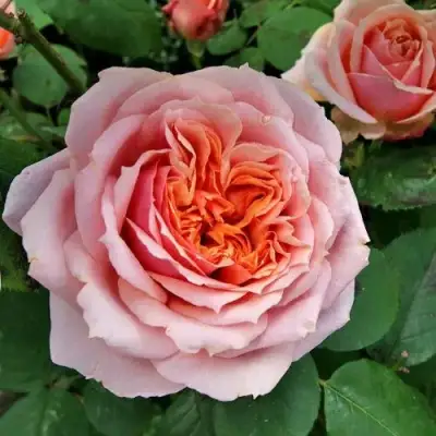 Цветки розы шраб Поль Бокюз имеют самую разнообразную окраску, начиная от оранжевого и абрикосового оттенков в бутоне до абрикосово-розовых цветов со светлым оттенком, когда они полностью распускаются. Этот сорт окрашен насыщенно и неповторимо, привлекая внимание своей бледной насыщенностью.