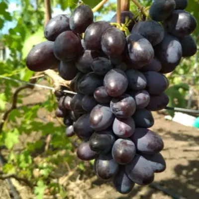 Сорт чисто рыночный. Вид у грозди шикарный, ягода длинная, темно-синяя, почти черная. Вкус гармоничный, без муската, но очень сладкий.