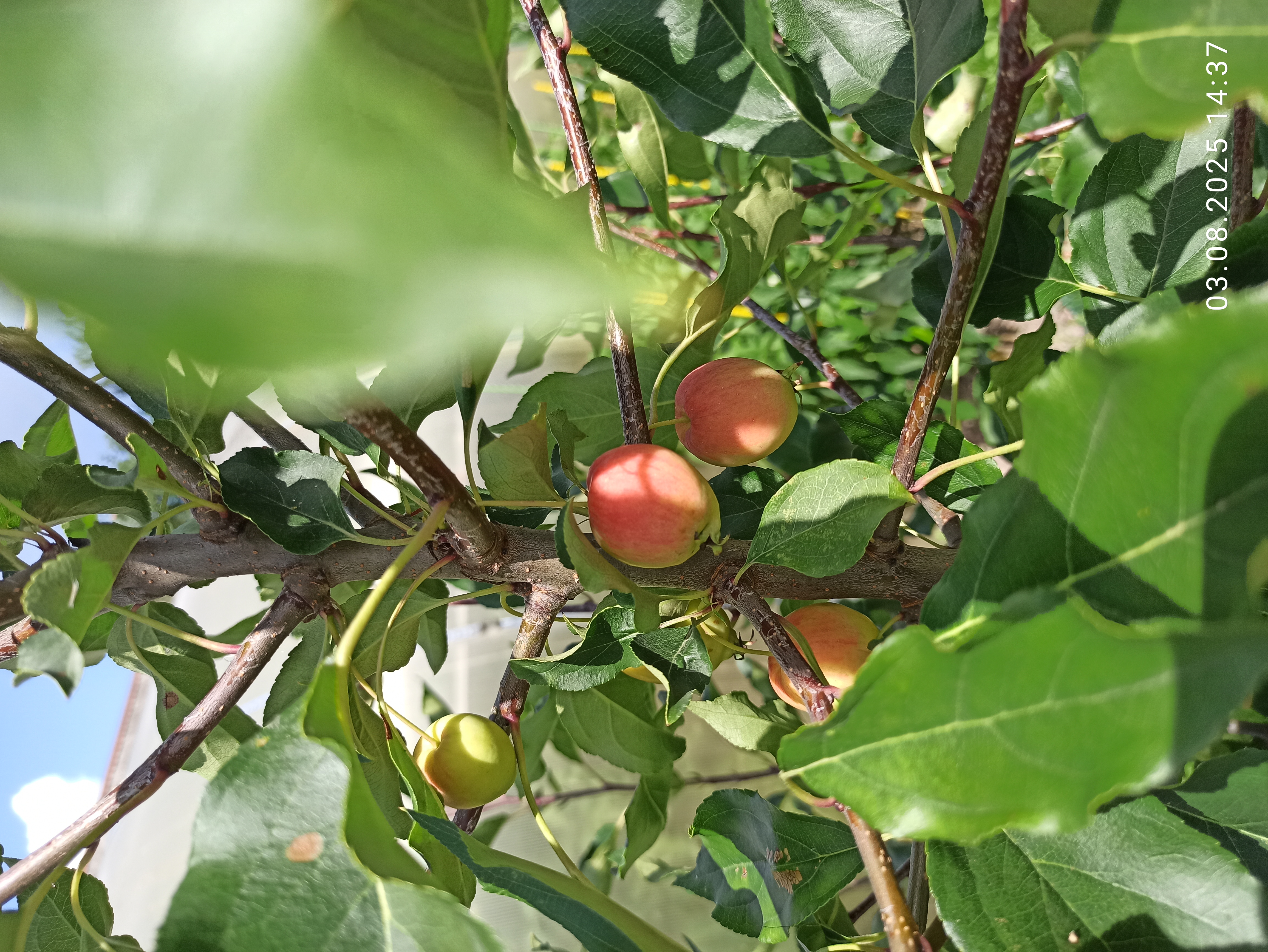 Ветви яблони Китайка долго прямые, а их концы устремлены кверху, создавая элегантный облик дерева. Побеги имеют темно-пурпуровый цвет и слабое опушение, что придает им особый шарм.
